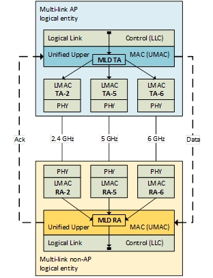 Wi-Fi 7 adds a new Unified Upper MAC (UMAC) layer to coordinate multi-link operations in a multi-link device (MLD) architecture (Figure 1). The UMAC provides the higher-layer protocols with a single MAC address for data transfers in a way that is very familiar to current Wi-Fi radio users. Underneath this, the UMAC contains logic to distribute the data block across the individual radio links, as appropriate, and manage the flow of data at this lower link level. This lower-layer operation is invisible to the higher-layer protocols so that they do not need to care how many radios are being used, or in what way.