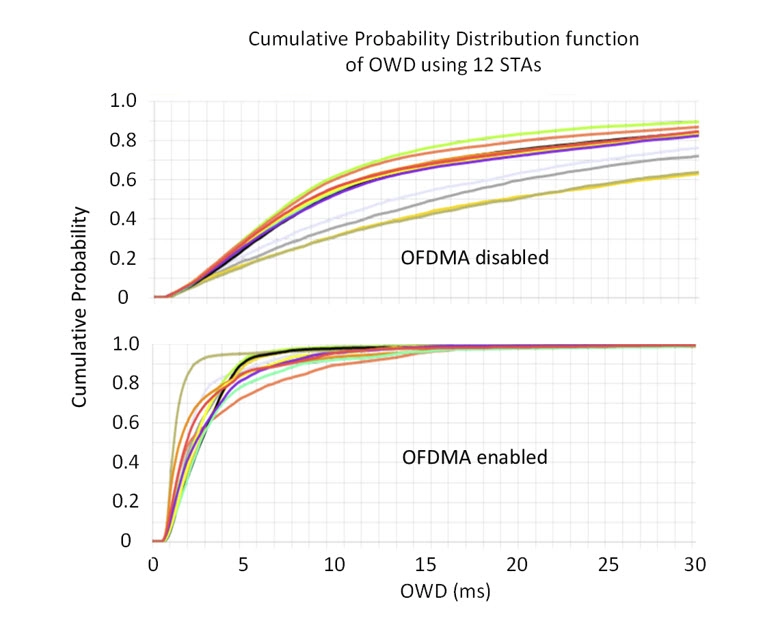 To guarantee consistently good experiences, device makers must know the full range of latency users can experience, how various mechanisms affect delay, and how often OWD exceeds maximum thresholds. Spirent’s OCTOBOX testbeds report not just the average latency but the full statistical distribution. For example, Figure 4 illustrates the change is OWD distribution gained by using OFDMA. This allows testers to fully characterize performance and determine a statistical measure of the probability of achieving any target delay—critical information for guaranteeing QoS in emerging applications.